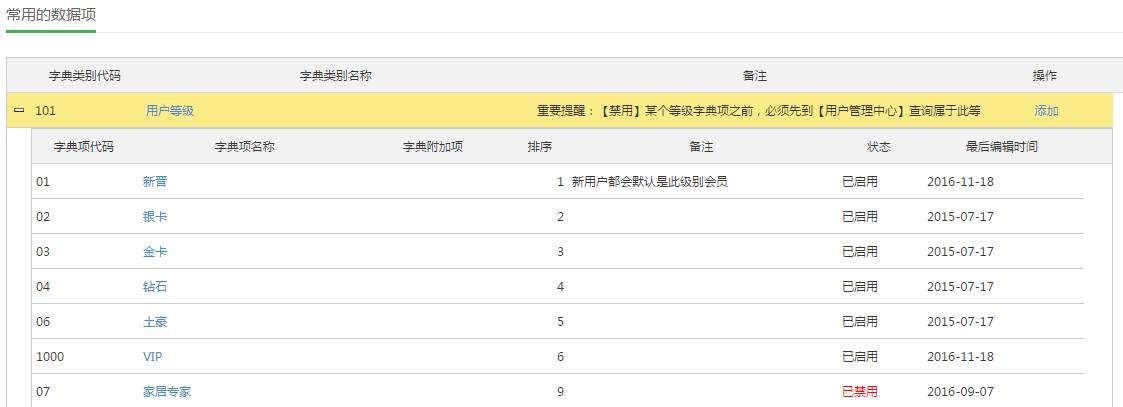 用户等级可在常用数据项中维护。点击字典代码101 所在行“添加”可增加用户等级,点击101展开项中字典项名称链接,可编辑用户等级名称。