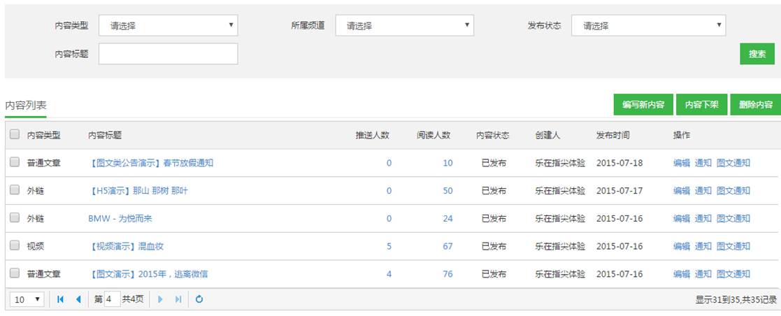 在内容管理中心上,可以对运营内容进行查询、新增、编辑、删除、预览、通知、下架等多样化操作。