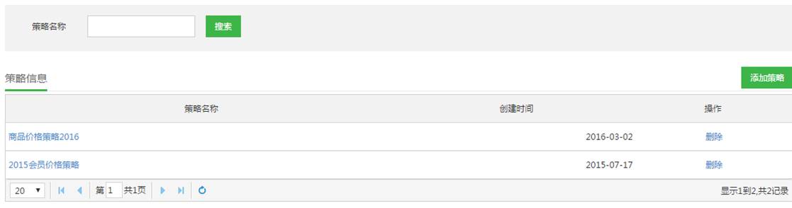 点击”添加策略”,可基于用户级别创建价格策略。系统支持”打折”和”现减”两种策略。