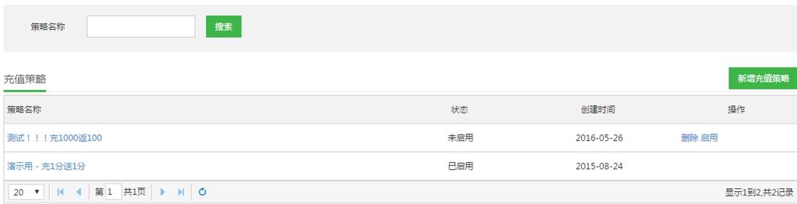 系统支持满赠类充值策略,点击列表上方“新增充值策略”可创建账户充值策略。