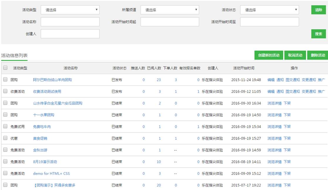在活动管理中心,点击“创建新活动”按钮,选择商品团购、免费体验、商家促销类型,即可开展活动。